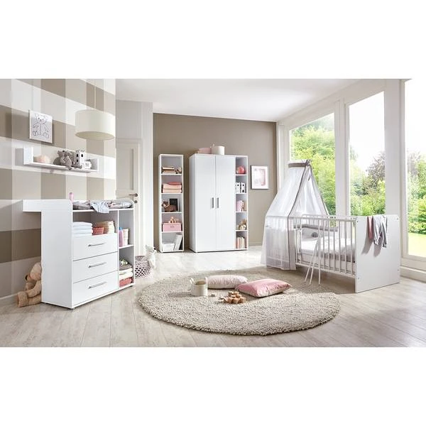 - Levering: Ledikant, verschoningscommode + open wandkast, kledingkast, staande open kast