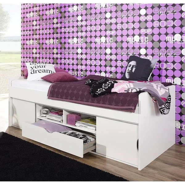 - Bed met 2 schuifdeuren links en rechts, 2 open vakken en 1 lade