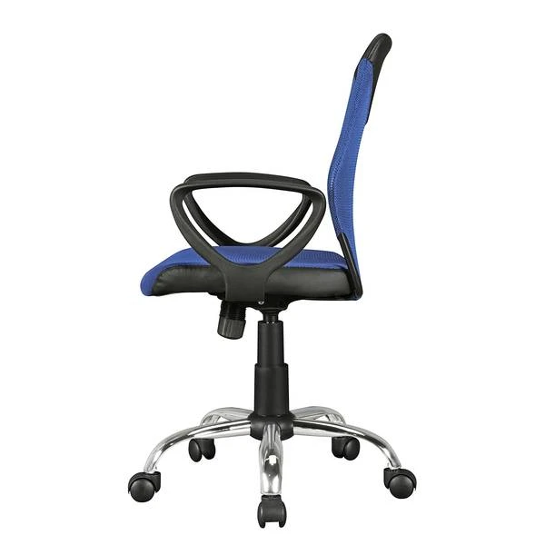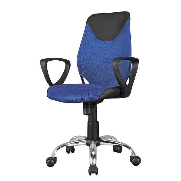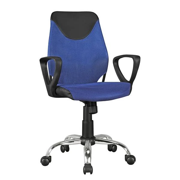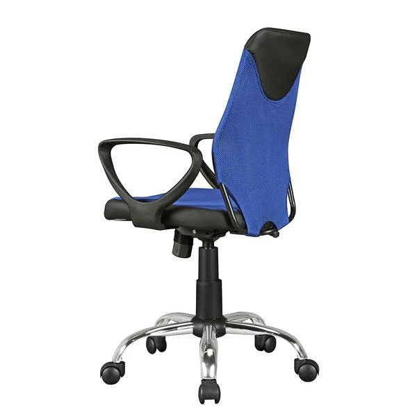 - Zitoppervlak en rugleuning: blauw; Hoofdsteun, armleuningen, wieltjes zwart, Kruisvoet zilverkleurig