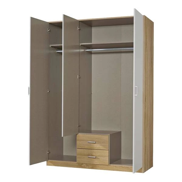- 2-deurs draaideurcombinatiekast met 2 inlegplanken, 2 lades, 2 kledingroedes, 1 spiegel en 1 scheidingswand