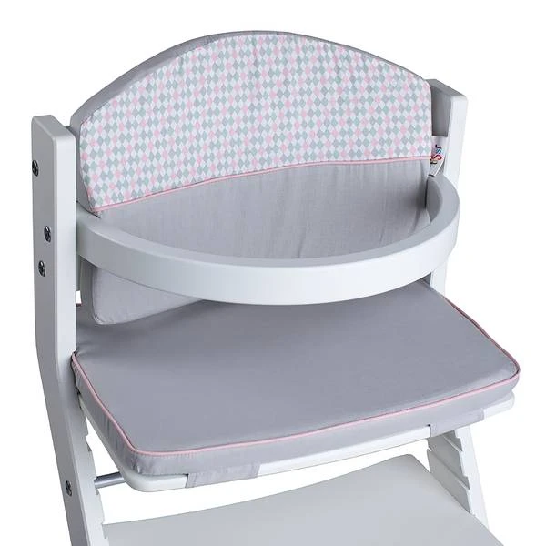 - lichtgrijs met roze rand, rugkussen voor de helft met pastelkleurige ruitjes